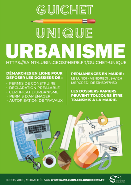 Nouveau ! Dès le 15 janvier 2024, déposez en ligne toutes vos demandes d'autorisation d'urbanisme sur le portail Guichet Unique Urbanisme de Saint Lubin.